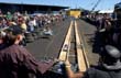 For the third consecutive year, mechanic enthusiasts gathered in a San Francisco junkyard with their modified power tool machines to race side-by-side down a 75-foot wooden track. Most machines, attached to electrical cords, were based on common and-held power tools such as circular saws, grinders, drills and belt sanders fitted with wheels. While most contestants competed for fun, some hoped to win the $1,000 final grand prize. In front of a cheering crowd, the muscle cars race in down the track, sometimes crashing in flames. Some machines reach top speeds and accidents can be a reality. Before entering the junkyard, spectators and participants were asked to sign a waiver of responsibility. Machines are based on hand-held power tools and can run on a variety of power sources, provided by either on board or external sources such as a 40 amps of 120AC per lane and 150psi of air." Story.