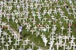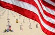 In silent protest against the war in Iraq, volunteers from the "Veterans for Peace" group in Santa Barbara, CA, erect white wooden crosses on the beach for every American serviceman killed in Iraq. Since last November, the memorial, fondly dubbed ''Arlington West,'' goes up at sunrise and down at sunset every Sunday to mark the rising death toll in Iraq. Each cross bears the name, rank, age and hometown of a fallen U.S. soldier. There was a total of 894 crosses on the morning of July 18, 2004. Story.