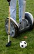 The Bay Area Segway Enthusiasts Group (SEG) meet regularly in a park in Sunnyvale, CA, to play a new and unique game, the Segway Polo. Two teams of four players each try to hit a ball into the opposite goal with a homemade mallet made out of PVC pipe, foam and duct tape, while riding their own Segway at a maximum speed of 8 mph. The Segway Human Transporter is a self-balancing, electric-powered transportation device that was released to the public in 2001 by inventor Dean Kamen who hoped to revolutionize public transportation with it. View Story.
