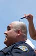 Police Officers from around the San Francisco Bay Area get their heads shaved during the "Buzz the Fuzz" event in San Francisco on May 13, 2005. The event was organized to raise money for children who have lost their hair as a result of chemotherapy treatments for cancer. For every thousand dollars raised or donated, one policeman gets his head shaved. “Buzz the Fuzz” was originally organized in 1994 by a policeman in Australia to show kids under treatment that they should not be too concerned with their appearance. View Story.